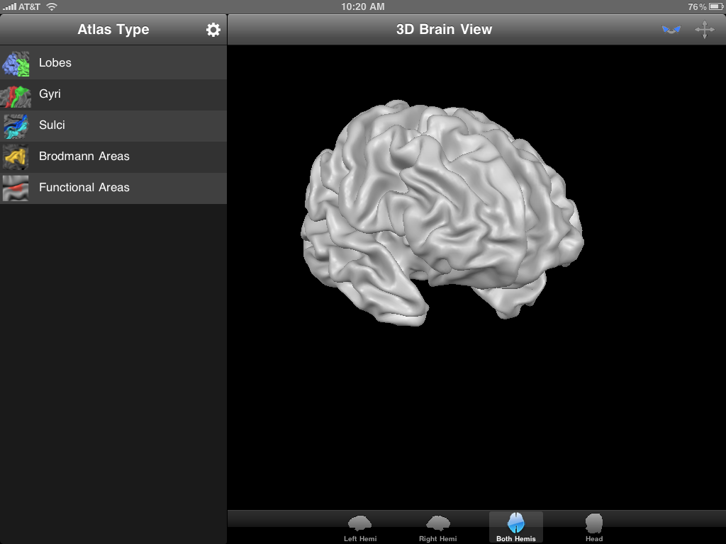The program information divided into five atlases, namely Lobes, Gyri, Sulci, Brodman Areas and Functional Areas. Each atlas contains numerous structures appropriate to its parent category. As the structures in the atlas are selected, the corresponding areas in the 3D brain representation are highlighted. Each entry also provides an arrow which loads the description and displays information such as the nomenclature, location, function and connectivity.